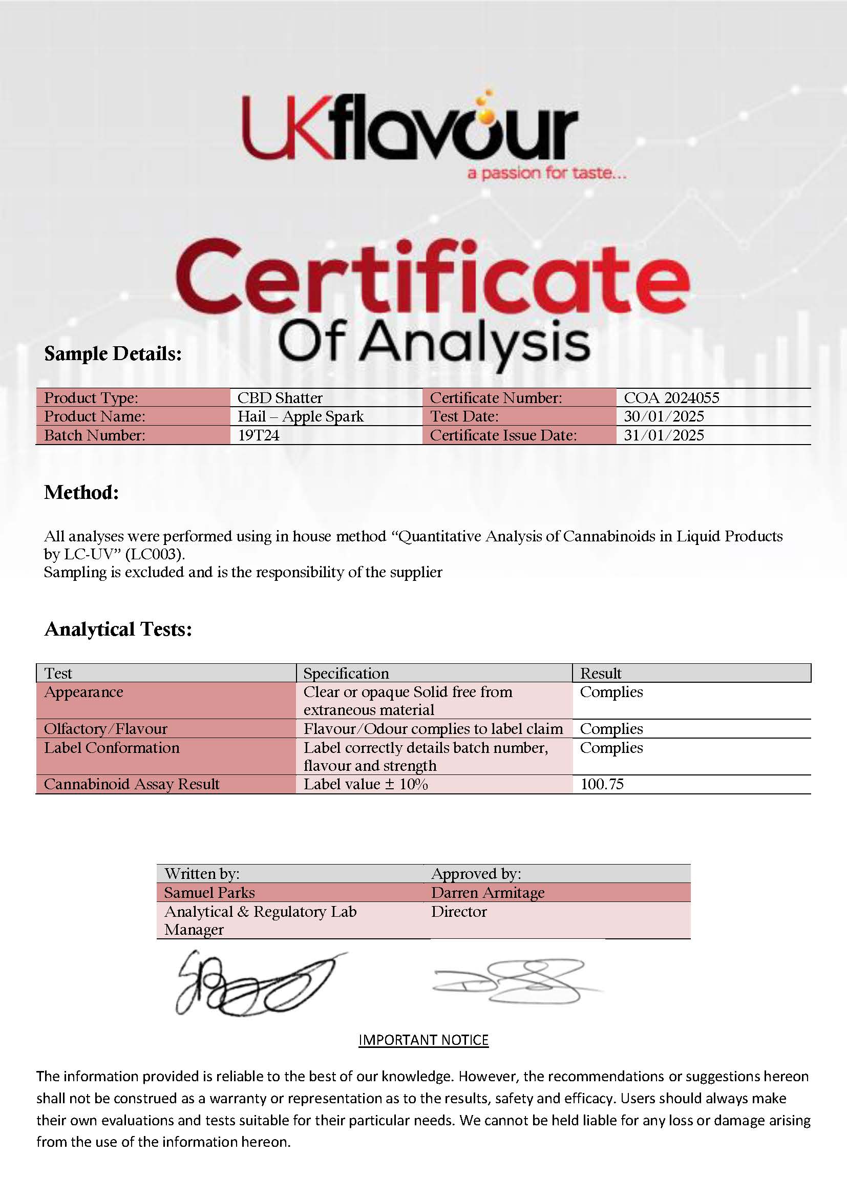 Hail Energy CBD shatter is a massive 99%+ pure before it’s infused with 5% of UK Flavour’s Pure Essences, specially formulated to give the best flavoured isolate in the UK. As the name suggests, the CBD shatter will shatter easily due to its brittle, hard texture during handling. It only contains concentrated CBD and no other cannabinoids or plant compounds inside. CBD isolate is the purest form of cannabidiol (CBD) available, extracted from hemp plants and refined to remove all other compounds, including other cannabinoids, terpenes, and flavonoids. CBD shatter is perfect for mixing with terpenes and then filling any of our vape carts. Each gram ordered comes sealed in a plastic storage case.